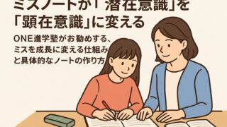 勉強法 同じミスを繰り返す子へ 「ミスノート」のススメとその作り方 「また同じミスを・・・」と悩むお母さんとお子さんへ。ミスノートは、繰り返すミスを減らし、成績を伸ばすためツールです。ONE進学塾がお勧めする、ミスを成長に変える仕組みと、具体的なノートの作り方を紹介します。 2025.10.27 勉強法